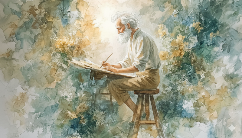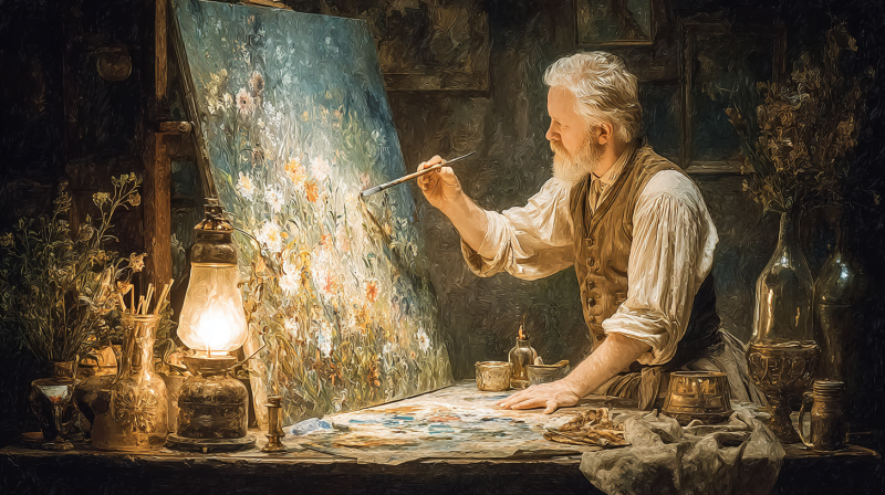 それでも彼は、最期の瞬間まで筆を握り続けた。死の床で震える手で描いた最後の一筆——それは、窓から差し込む朝日を受けて咲く、たった一輪の野の花であった。