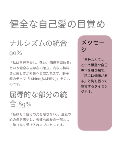 もう一つ、「屈辱的な部分の統合(89%)」という深いテーマも浮上しました。