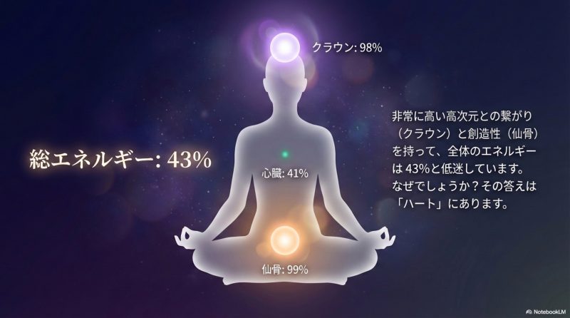 オーラ分析では、クラウンチャクラ98%・仙骨チャクラ99%と、