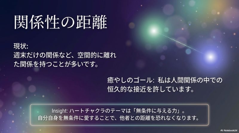 目標として示されたのは「人間関係の中での恒久的な接近を許す」こと。自分を無条件に愛することが、その扉を開く鍵です。